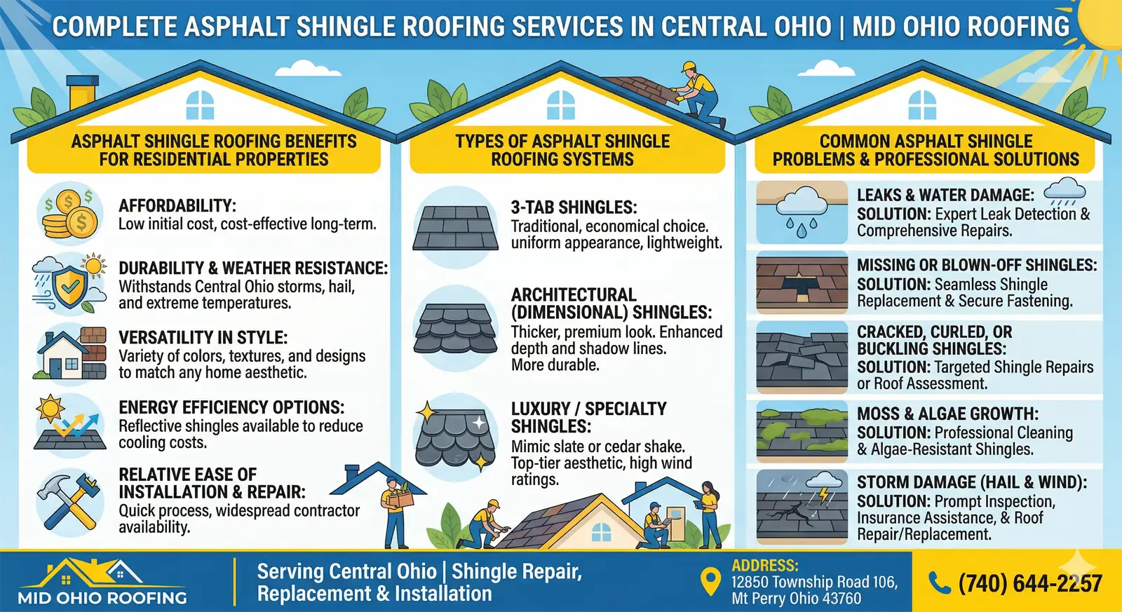 As a trusted roofing contractor in Ohio, Mid Ohio Roofing delivers asphalt shingle roofing services backed by family-owned values, full insurance coverage, 25+ years of experience, and strong warranty options that help homeowners feel confident in their investment.