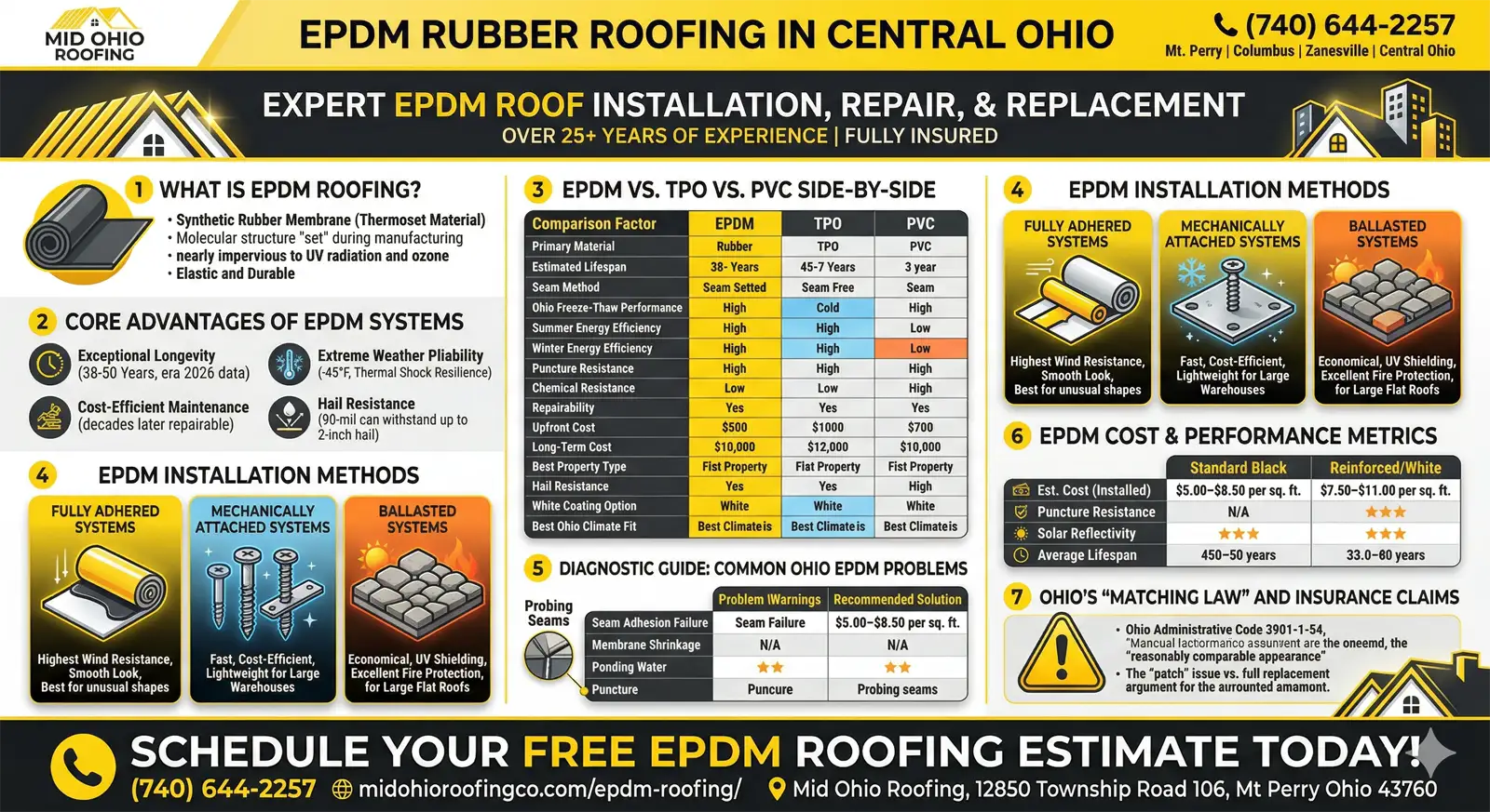 • Ohio Freeze-Thaw Climate Expertise — We know from decades of Central Ohio roofing experience that EPDM’s exceptional flexibility in cold temperatures is its greatest local advantage, and we install every system to maximize that performance through Ohio’s most demanding seasonal conditions.