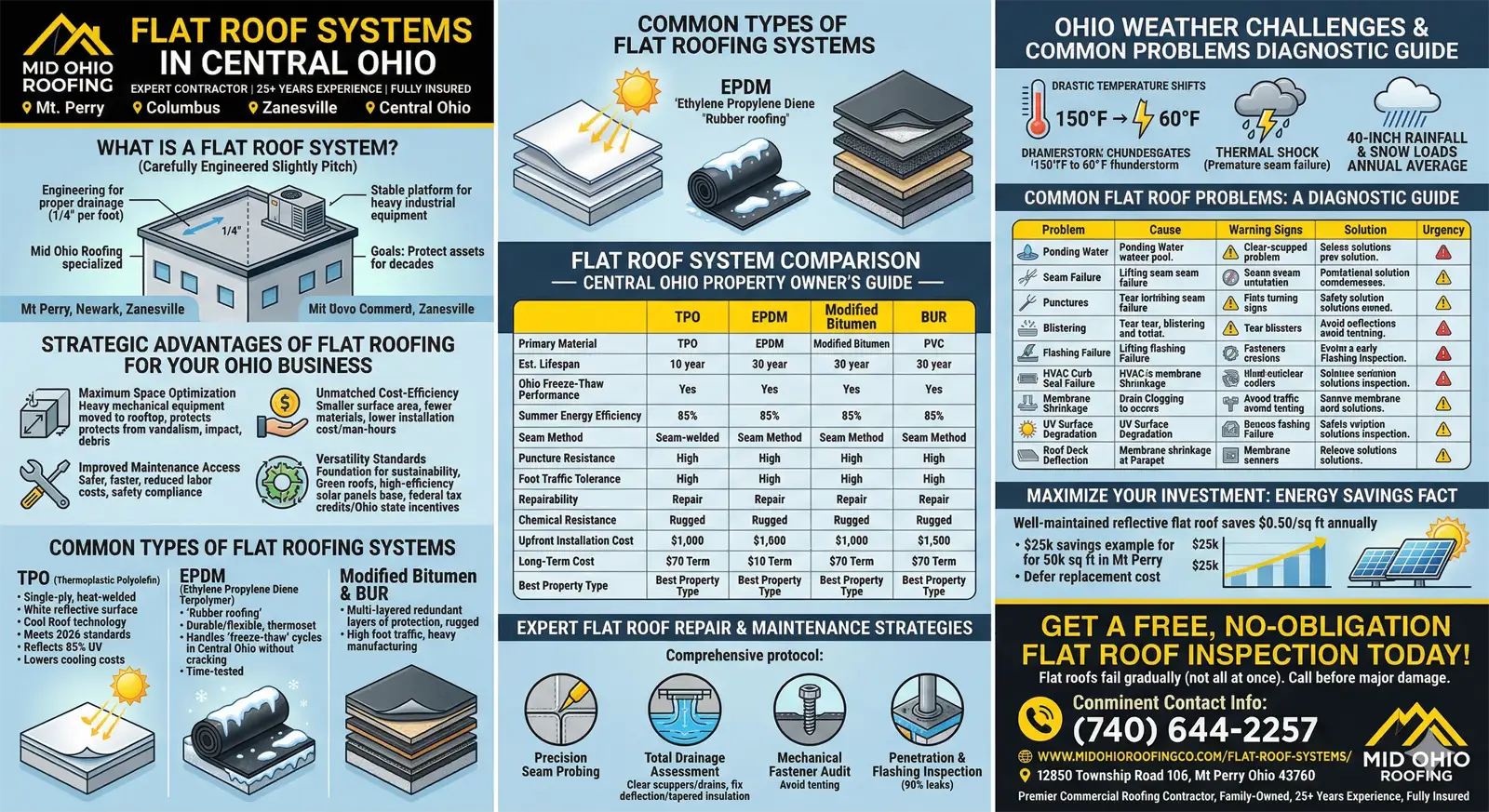 Flat roofs in Central Ohio face a unique combination of challenges, from summer UV exposure and thermal shock to winter snow loads and freeze-thaw cycling, that accelerate wear and create specific failure patterns that property owners need to recognize early. This diagnostic guide covers the most common flat roof problems Mid Ohio Roofing encounters across commercial and residential properties in the region.